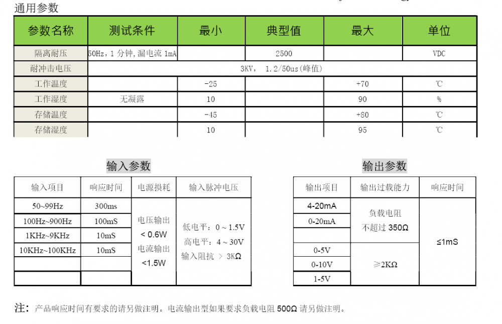 50~99Hz | 300ms | 电压输出 < 0.6W 电流输出 <1.5W | 低电平:0 ~ 1.5V 高电平:4 ~ 30V 输入阻抗 > 3KΩ | 4-20mA | 负载电阻 不**过350Ω | ≤1mS | |